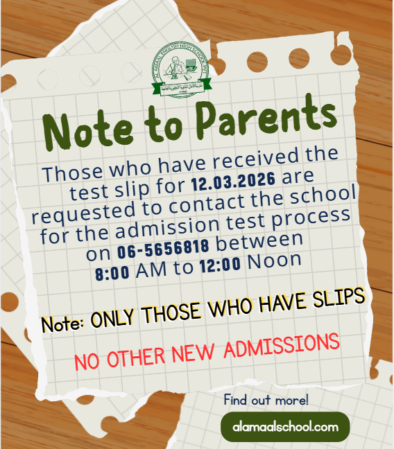 Those who have received the test slip for 12.03.2026 are requested to contact the school for the admission test process on 06-5656818 between 8:00 AM to 12:00 Noon